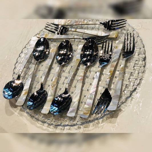 Add some lustre to your kitchen items with our shining cutlery. Combining stainless steel with nacre/mother of pearl inlay handles, our spoon and fork set will definitely add a luxurious touch to your dining table.