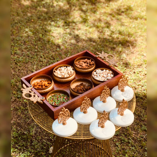 Atithi DryFruit Wooden Tray | 6 Metal Bowl